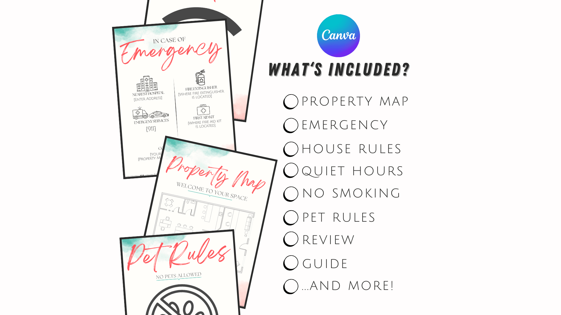 ● Welcome Sign ● Property Map ● Emergency Info ● Check-in/out Guide ● Wifi Info ● TV Info ● Appliances Info ● House Rules ● Quiet Hours ● No Smoking ● Pet Rules ● No Party Sign ● Local Recommendations ● Toilet Rules ● Review Request