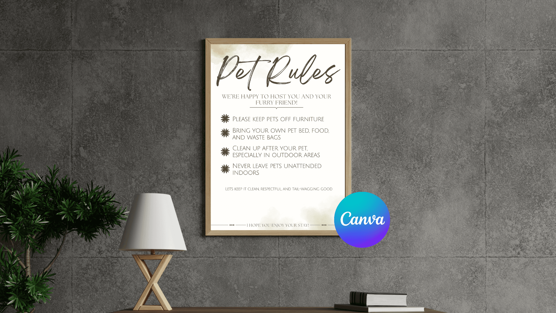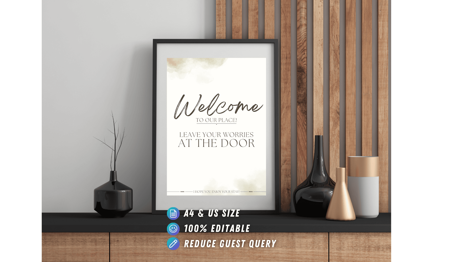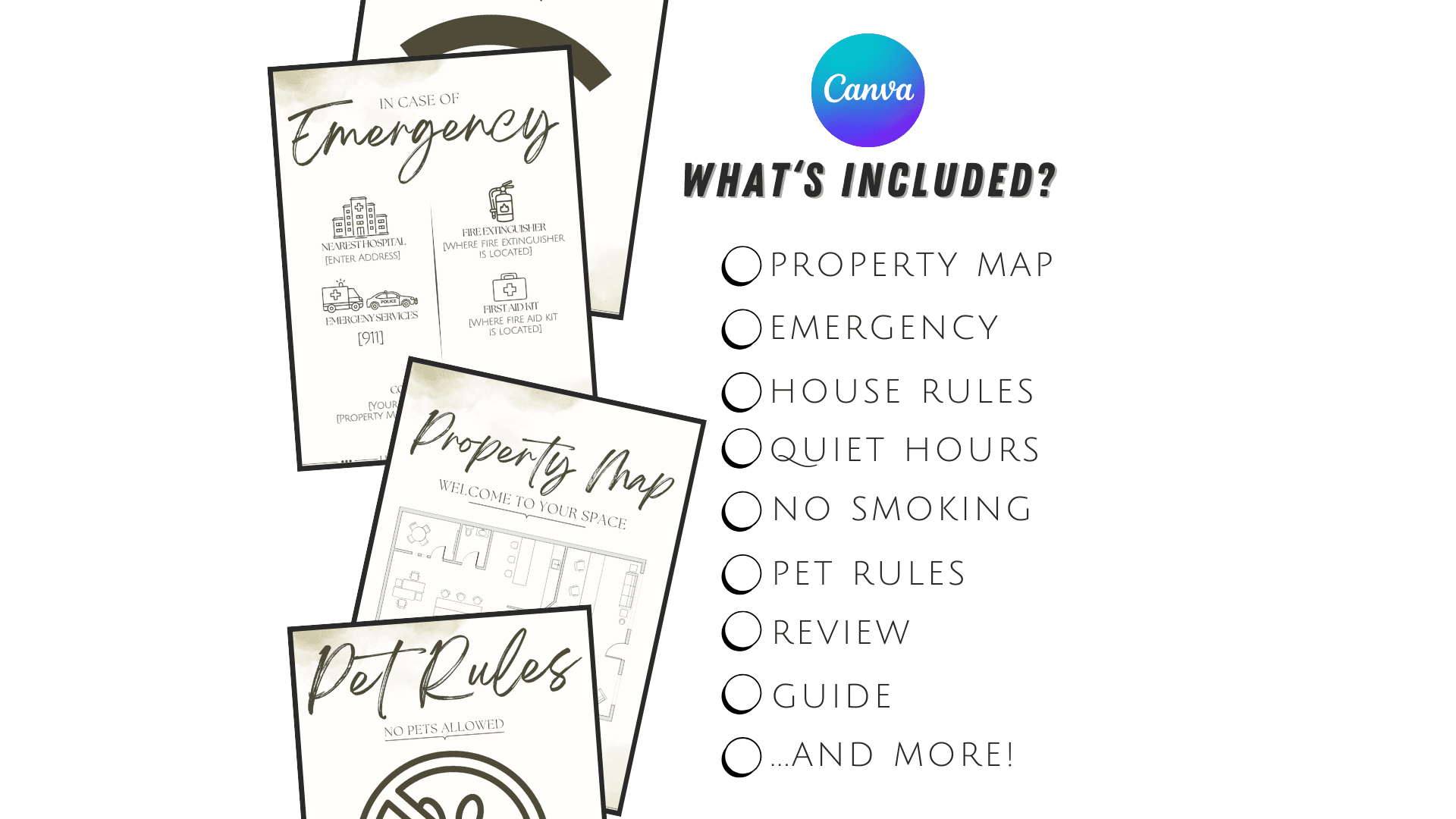 ● Welcome Sign ● Property Map ● Emergency Info ● Check-in/out Guide ● Wifi Info ● TV Info ● Appliances Info ● House Rules ● Quiet Hours ● No Smoking ● Pet Rules ● No Party Sign ● Local Recommendations ● Toilet Rules ● Review Request